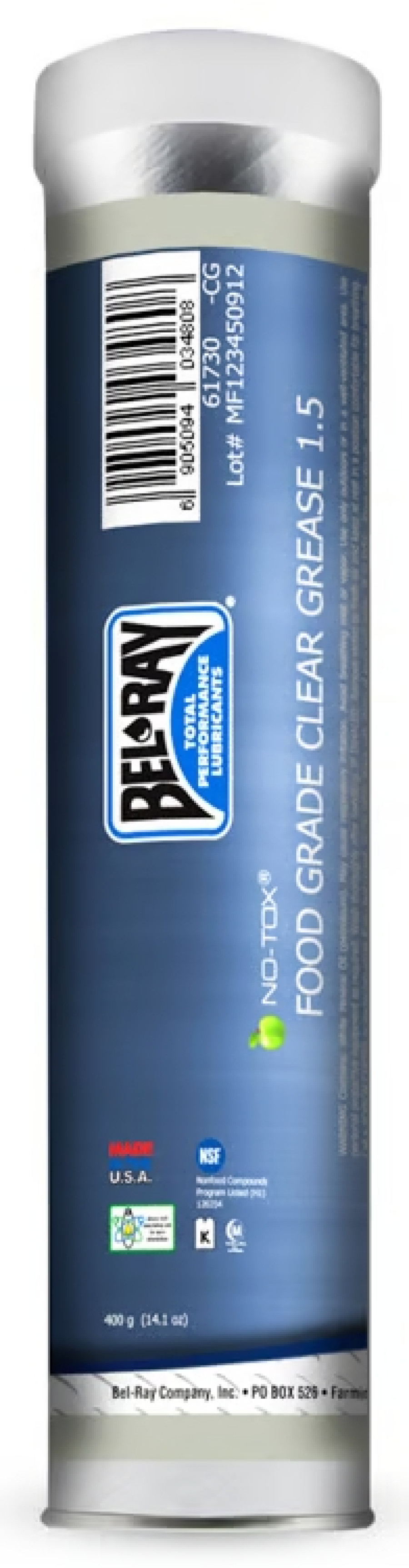 No-Tox Food Grade Clear Grease, comúnmente conocido como No-Tox Clear Grease, es una grasa compuesta por aceite blanco base mineral, espesantes complejo de aluminio para equipos y maquinaria de alimentos. No-Tox Food Grade Clear Grease está registrado como NSF H1, para el uso donde puede ocurrir contacto incidental con comestibles. No-Tox Food Grade Clear Grease es una grasa para propósitso generales desarrollada específicamente para uso en la industria “limpia” tal como embotellado, procesadoras de jugos, viñas, mataderos (aves y animales mayores), fábricas de cecinas, packing de frutas, plantas conserveras, fábricas de helados, etc. No-Tox Food Grade Clear Grease está reforzado con inhibidores de herrumbre y corrosión para añadir protección en condiciones húmedas.